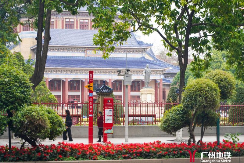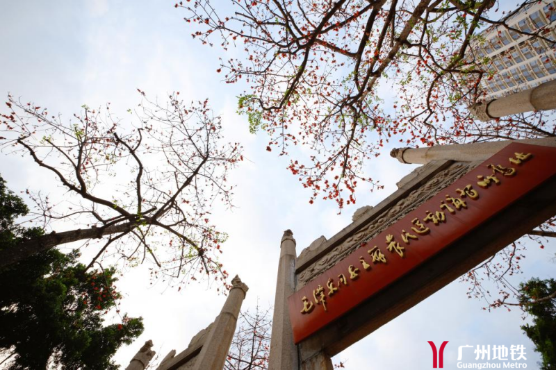 C口出站,向后(往东)步行80米,即见农讲所标志性建筑“棂星门”。