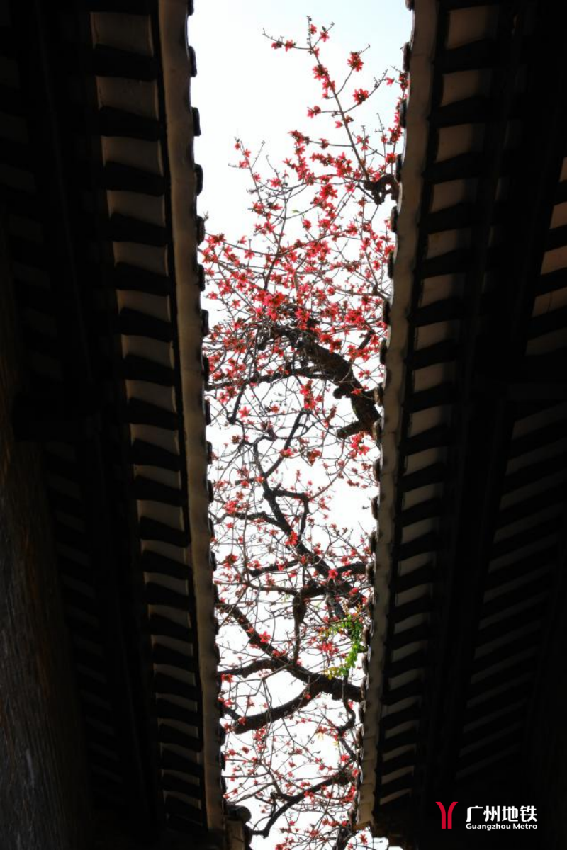 穿过棂星门,走进明伦堂与光霁堂之间的通道——这里藏着农讲所最经典的木棉机位。英雄花在两边屋檐间怒放,215岁的古木棉与600年学宫同框,红墙黄瓦配烈焰木棉,是古风大片的最佳取景地。