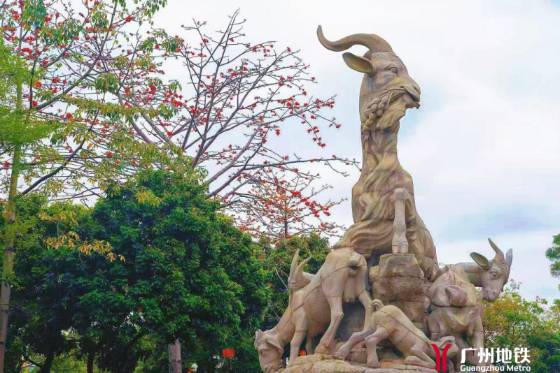 一树木棉映衬巍然挺立的五羊石雕,如诗如画。