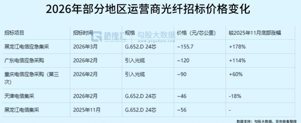 近日,黑龙江电信发出应急采购公告,把G.652.D24芯光缆的单芯公里价格,直接推到了155.7元(含税130元)。这价格相比2025年11月的底部涨幅高达178%,相比同期天津电信招标价,更是飙涨了239%。