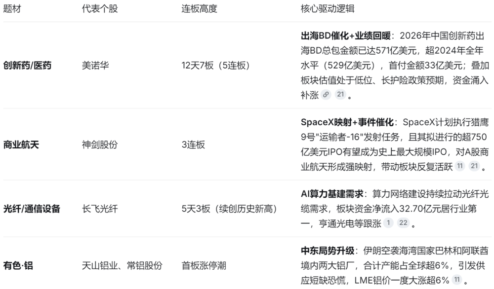 医药板块美诺华(7天6板)成为市场最高人气标杆,商业航天概念股神剑股份走出3连板,光纤概念中利集团走出7天5板,市场资金主要围绕医药、商业航天、光纤、有色·铝、玻纤五大题材方向聚集。