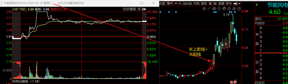 长上影线 + 大阳线指:收盘价显著高于开盘价(大阳线实体),但盘中曾大幅冲高后回落,留下长度明显超过实体的上影线(通常上影线长度≥实体长度的 1.5 倍),实体涨幅≥5%(大阳线标准)。
