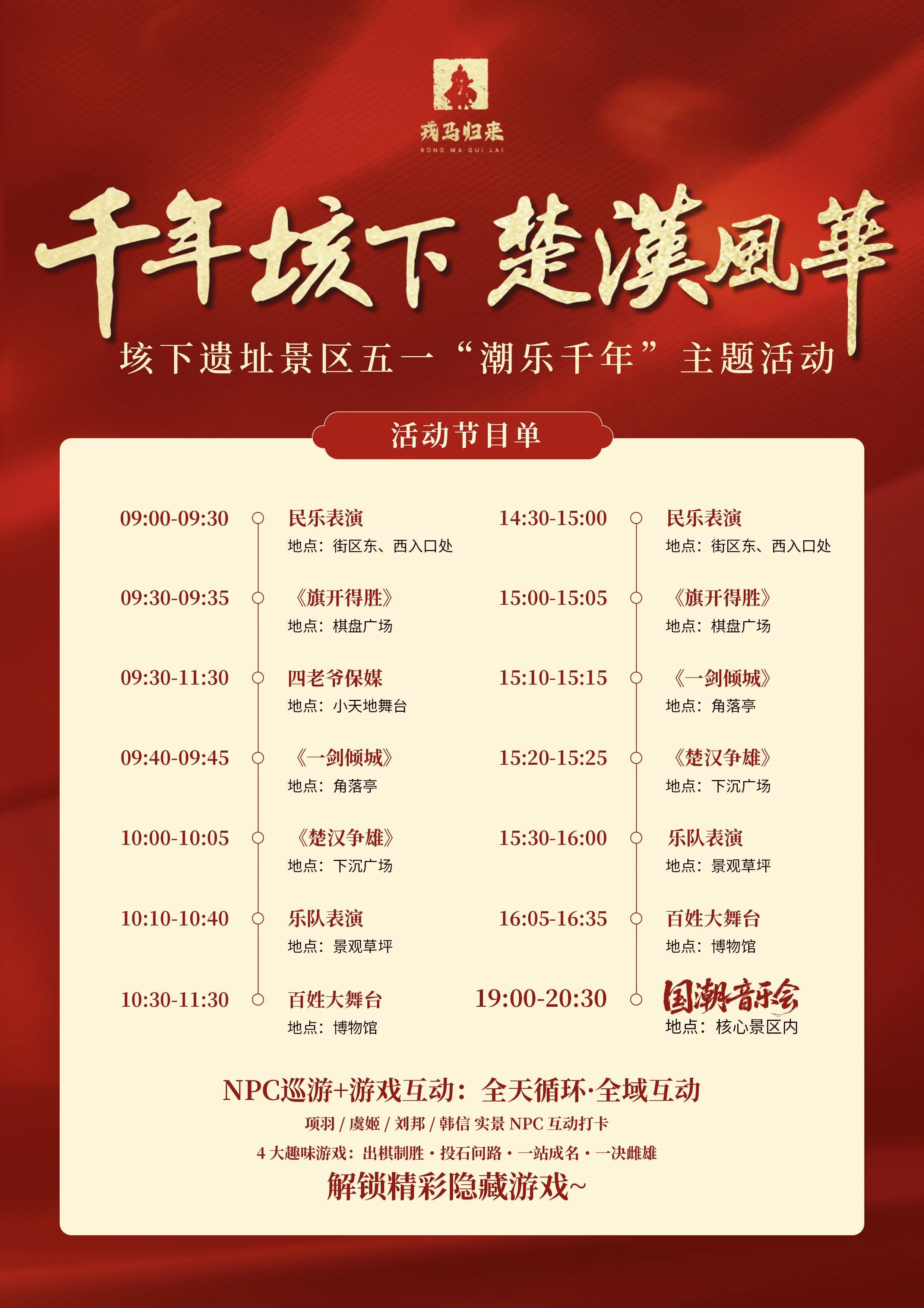 5月1日至3日,垓下景区作为主会场,上演《梦回垓下·日夜有戏》楚汉风云国潮电音节——民乐混搭电音,汉服蹦迪、手机灯海,把两千年前的楚汉故事玩出了年轻味。