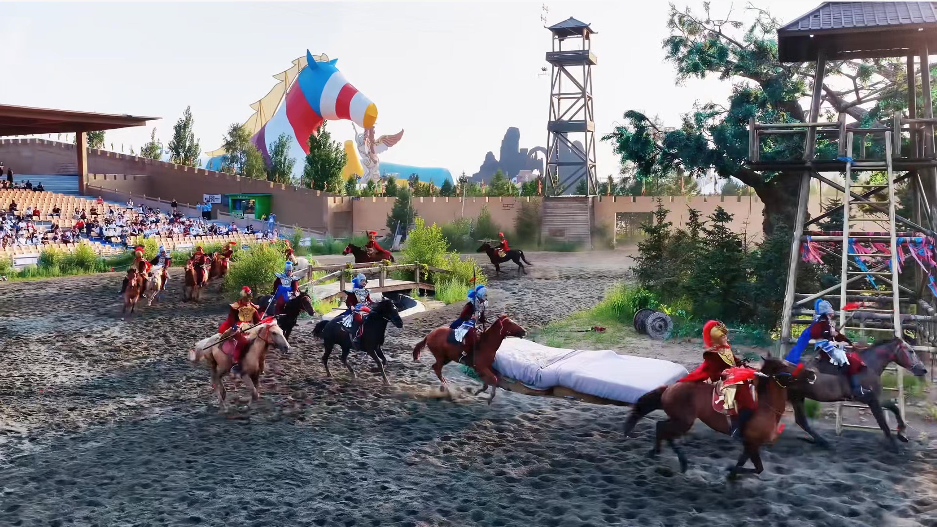 游客入园即分楚汉两大阵营,领取军籍牌,全天沉浸于五幕故事线:战前动员、大型实景马战《霸王铁骑突围战》、电音泼水大战、两军冲锋夺旗,入夜更有“汉兴大典”烟花秀与万人齐放孔明灯。楚汉市集里,霸王烤肉、大风歌酒肆、虞姬茶寮应有尽有,传令兵来回奔跑通报战况,紧张感拉满。
