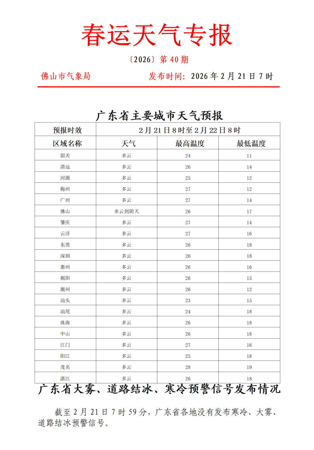 22日(初六):韶关、清远和肇庆市县多云间阴天,有小雨,其余市县多云间阴天,局部有零星小雨,大部市县早晚有(轻)雾。早晨最低气温:粤西和珠江三角洲中南部市县17~20℃,其余大部市县13~16℃。