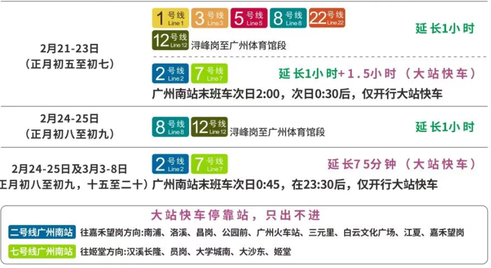 其中,2月21至23日(农历正月初五至初七)延长2.5小时,次日0:30—2:00开行大站快车,广州南站末班车为次日2:00;
