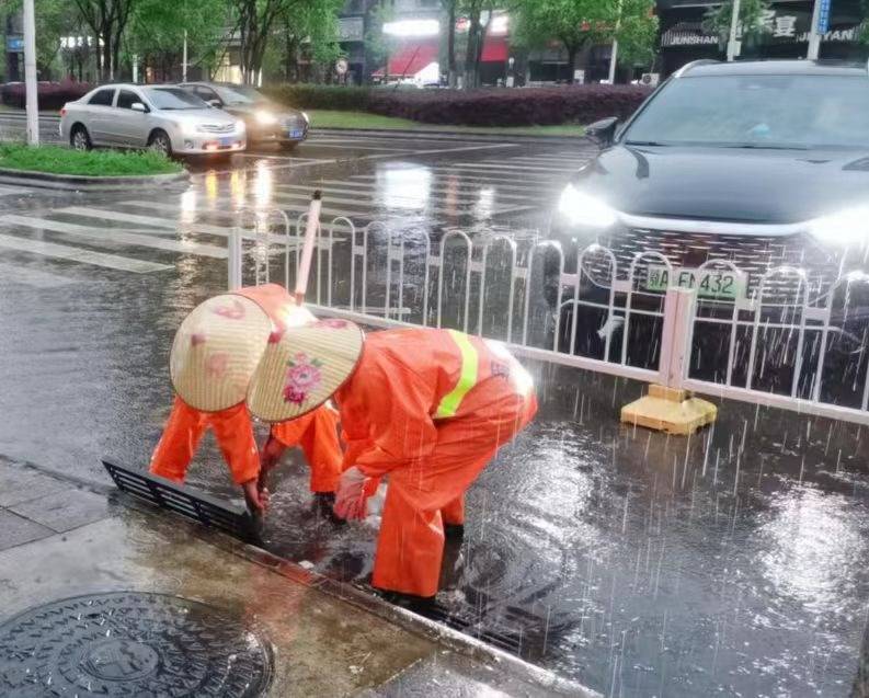 江汉区采取“定点值守+动态巡查”模式,980名环卫工人雨中坚守,对132个短时积水点位实施“人工清掏+机械疏通”快速处置,累计疏通排水口320处。