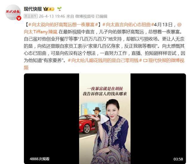 然而,光鲜背后,豪门也有豪门的烦恼。向太话锋一转,便谈到了让她颇为头疼的儿子向佑。她坦言,向佑做事“好高骛远”,总怀揣着一夜暴富的梦想。尽管母亲对他创业开餐厅等事业“几百万几百万”地给予支持,但结果却无一例外,都以亏损收场。